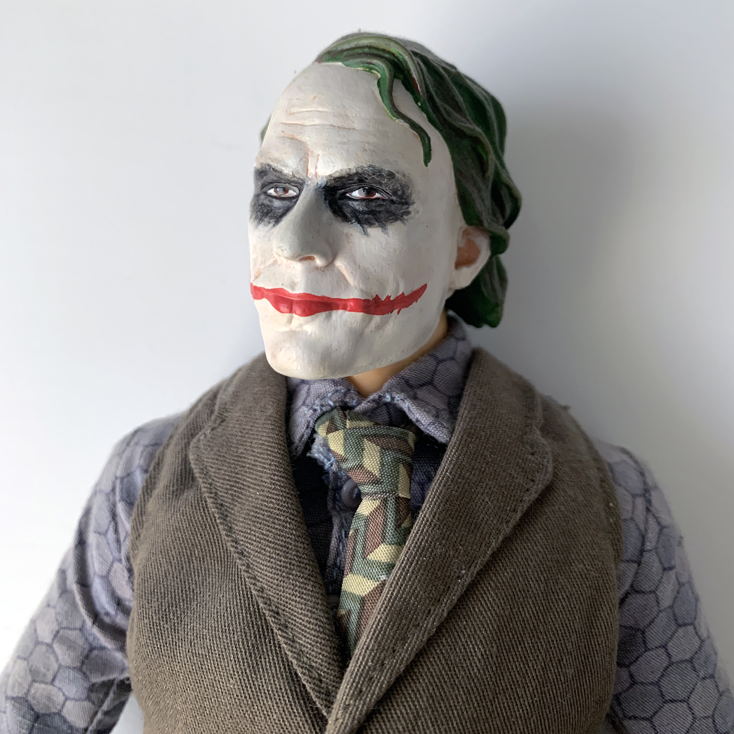 Batman’s The Dark Knight features Gotham City’s wickedest villain as a 1:6 scale figure! The Joker (Heath Ledger) is dressed in an intricate, fabric costume consisting of a shirt, tie, vest, blazer, pants, and loafers, and features movie-specific accessories, including a knife and a handgun. The figure also comes with a display stand. Limited Edition!