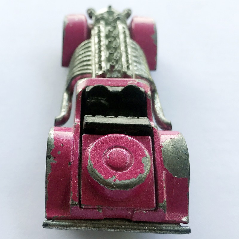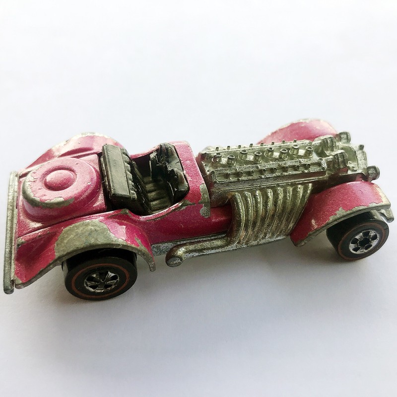A long, lean roadster with a sixteen-cylinder engine and sixteen exhaust pipes. It was only produced for one year, and can be found in ten of the eleven ’73 enamel colours. The Sweet 16 was one of only three new castings for 1973 from the Hot Wheels Mainline series. This notable model is a long, lean roadster featuring a V16 engine, exposed side pipes, and an openable trunk.