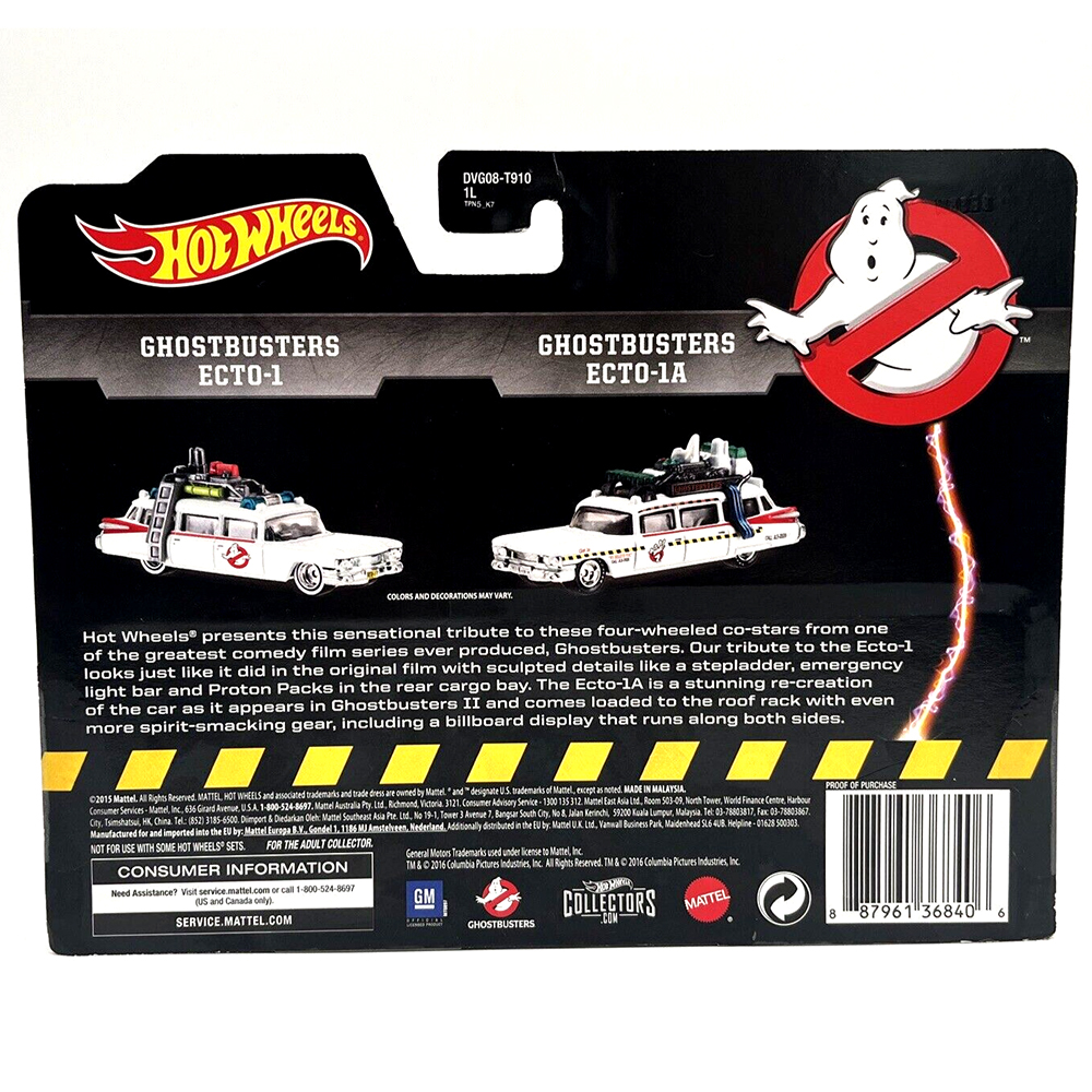 Hot Wheels® presents this sensational tribute to these four-wheeled co-stars from one of the greatest comedy film series ever produced, Ghostbusters. Our tribute to the Ecto-1 looks just like it did in the original film with sculpted details like a stepladder, emergency light bar and Proton Packs in the rear cargo bay. The Ecto-lA is a stunning re-creation of the car as it appears in Ghostbusters II and comes loaded to the roof rack with even more spirit-smacking gear, including a billboard display that runs along both sides.