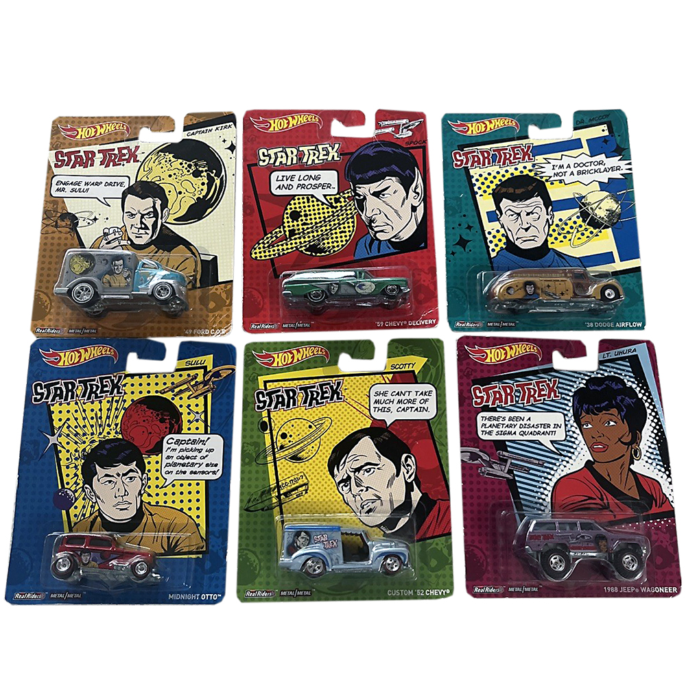 Hot Wheels Star Trek Captain Kirk, Spock, Dr McCoy, Scotty, Lt Uhura, and Sulu Real Riders Six Die-Cast Vehicles (New in Blister Pack) 2013 Mattel