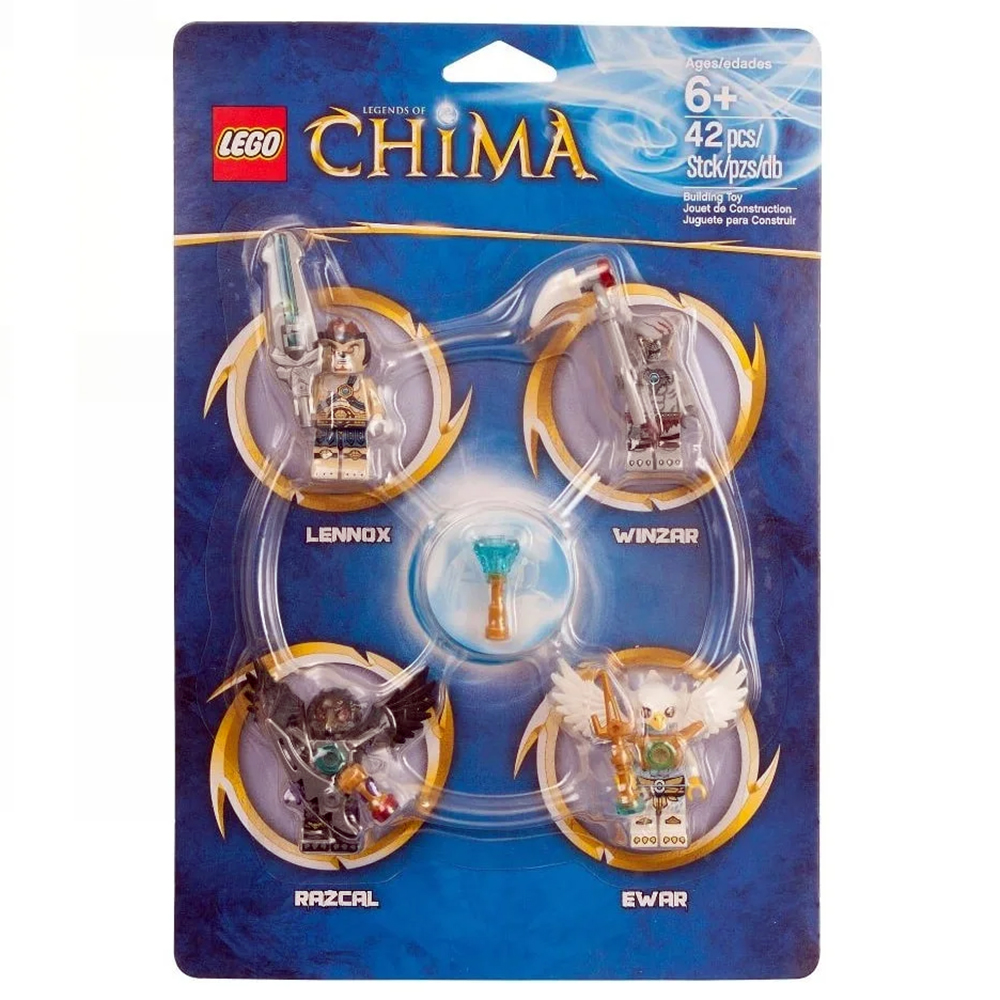 LEGO 850779 Legends of Chima Minifigure Accessory Set is a 42-piece Chima exclusive set with four minifigs released in 2013. It includes four Legends of Chima minifigures: Lennox, Winzar, Razcal, and Ewar with an assortment of weapons.