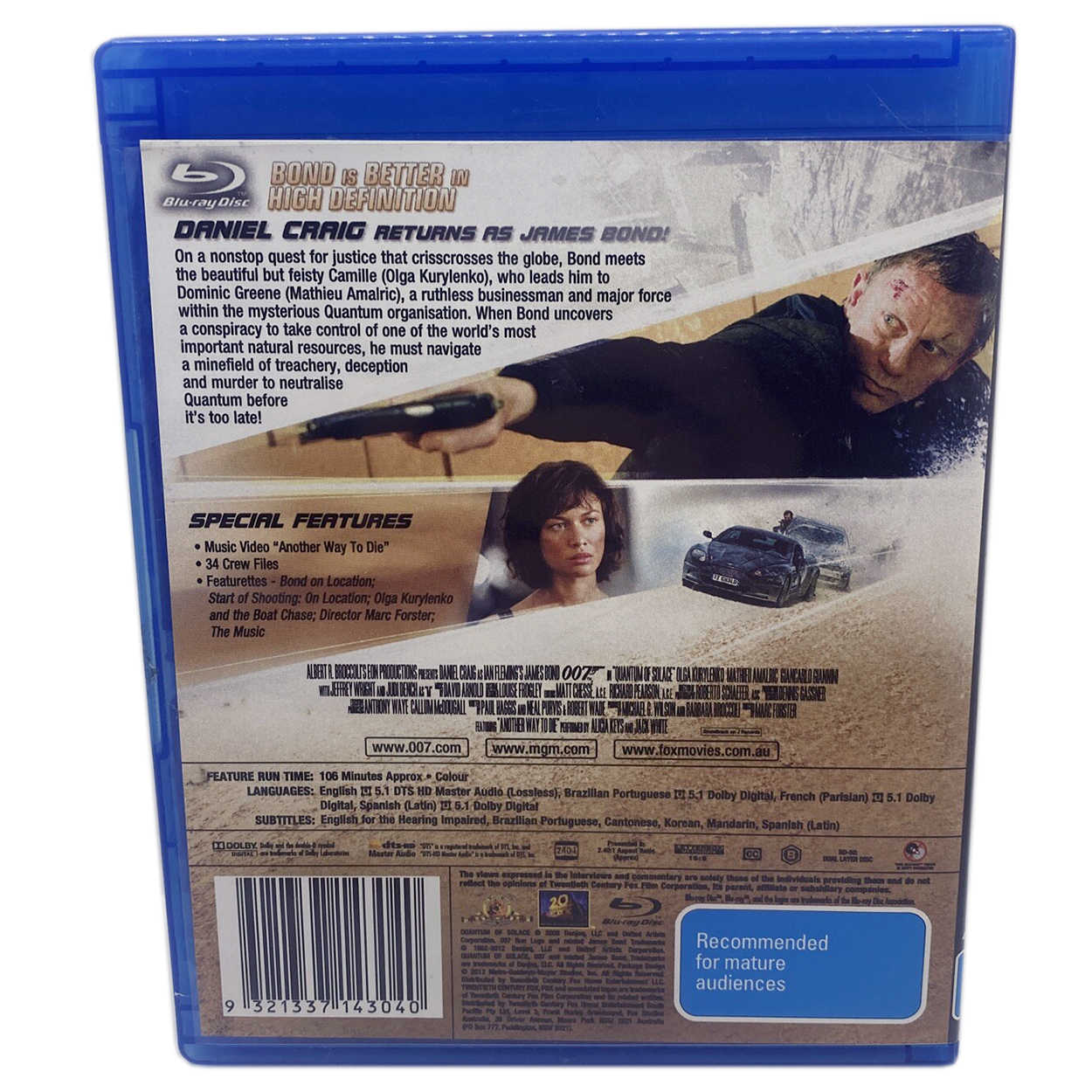 Quantum of Solace (starring Daniel Craig as James Bond) Blu-Ray Disc 5:1 DTS HD Edition (ex-Display Stock) Rated M