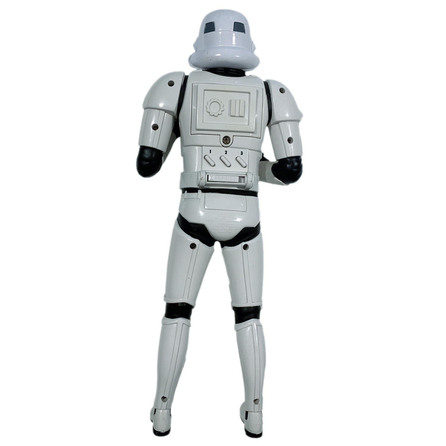 When the electronic laser target is hit, the stormtrooper blasts back at you!