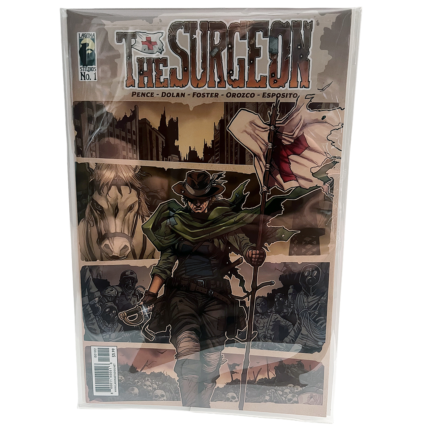 The Surgeon #1, published by Laguna Studios, is a post-apocalyptic samurai western comic series featuring a nomadic physician, Doc Hanover, as she navigates a brutal, collapsed frontier.